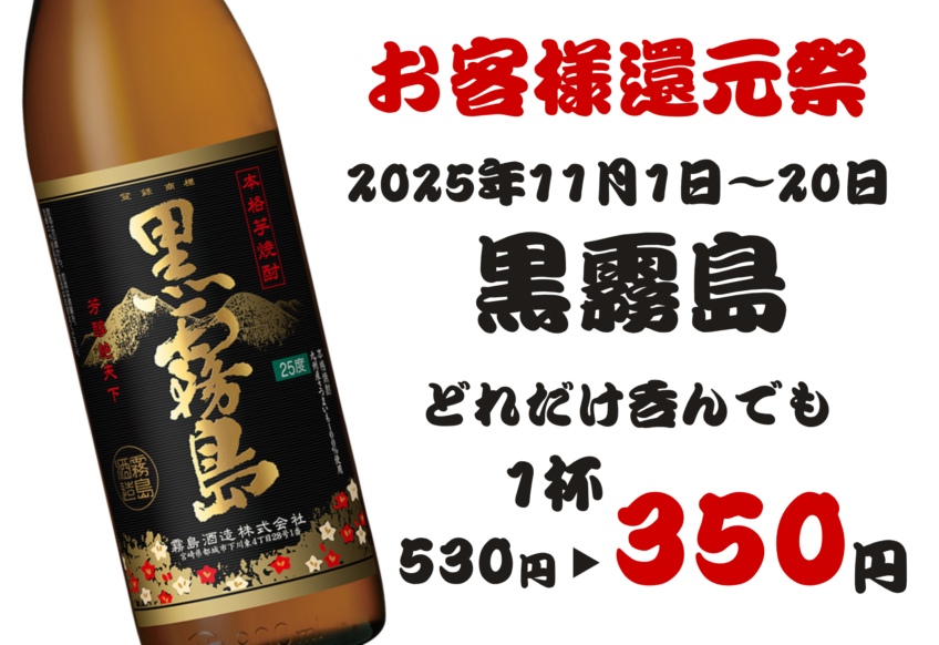 日頃より戦国焼鳥家康をご利用いただき、誠にありがとうございます。皆様への感謝の気持ちを込めて、下記期間中「お客様還元祭」を開催いたします。 期間: 2025年11月1日(土)~11月20日(木)対象商品: 芋焼酎〈黒霧...
