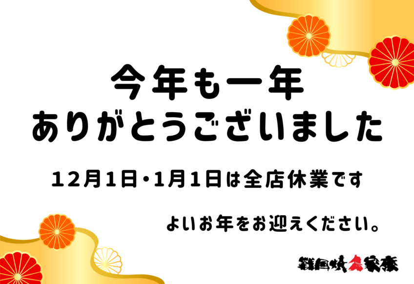 いつも 戦国焼鳥家康 をご利用いただき、誠にありがとうございます。本年も至らぬ点があったかと存じますが、皆様にご愛顧いただき、心より感謝申し上げます。 誠に勝手ながら、12月31日・1月1日は休業 とさせていただきます...