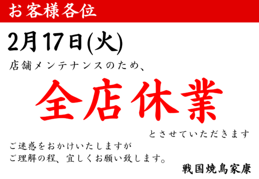 いつも戦国焼鳥家康をご利用いただき誠にありがとうございます。 店舗メンテナンスを行いますので、 2026年2月17日(火)は 全店休業とさせていただきます。 ご迷惑をおかけいたしますが、ご理解のほどよろしくお願いいたし...