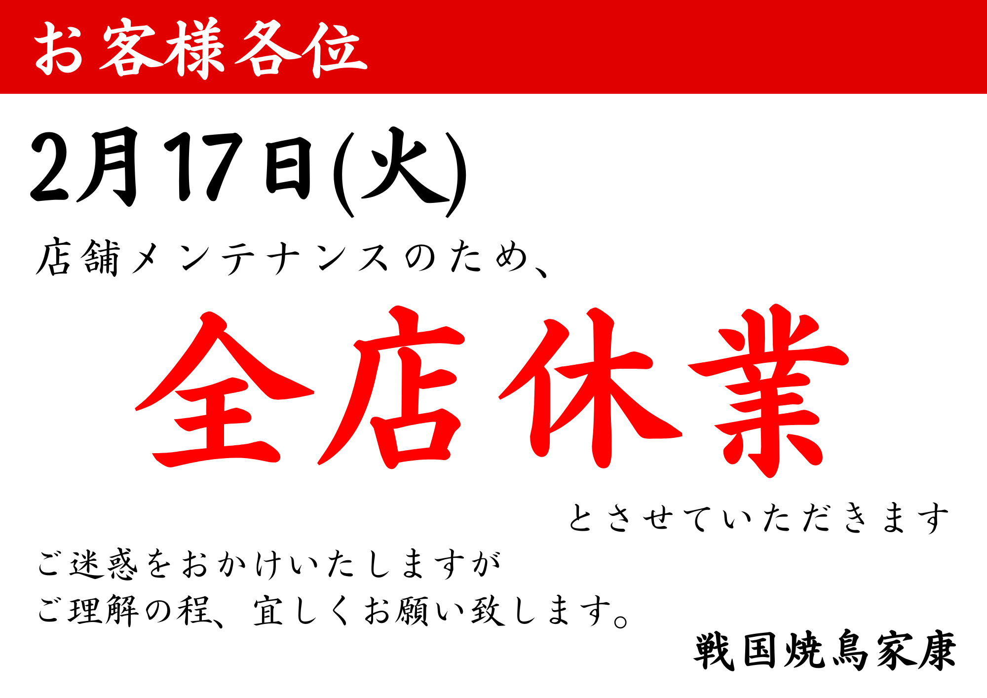 全店休業のお知らせ